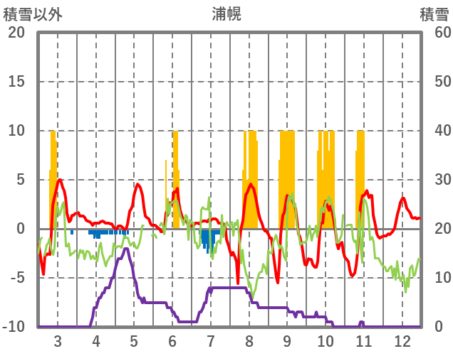 | 日 | 時 | 気温 | 降水 | 風向/風速 | 日照 | 積雪 | 降雪 |
