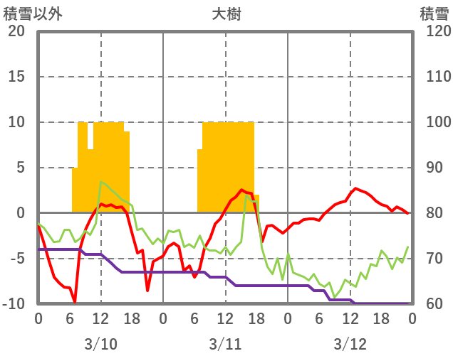 | 日 | 時 | 気温 | 降水 | 風向/風速 | 日照 | 積雪 | 降雪 |