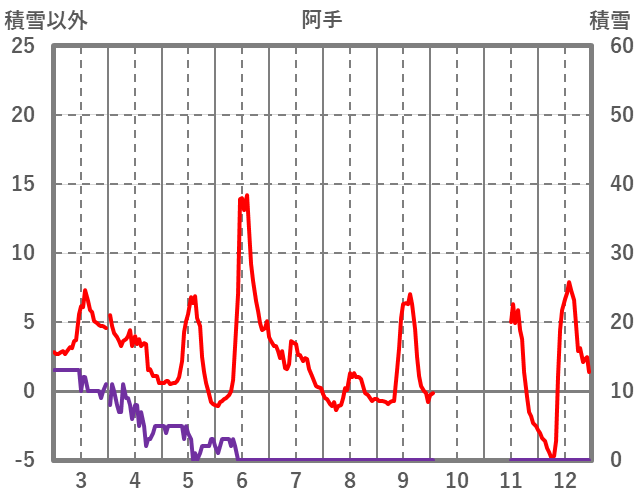 | 日 | 時 | 気温 | 降水 | 風向/風速 | 日照 | 積雪 | 降雪 |