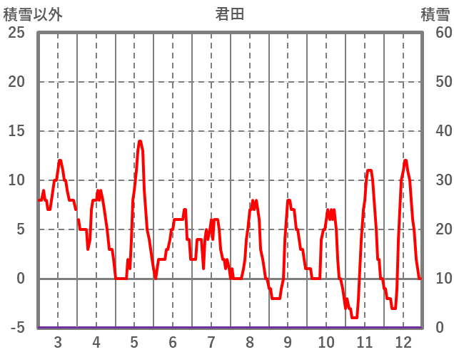 | 日 | 時 | 気温 | 降水 | 風向/風速 | 日照 | 積雪 | 降雪 |