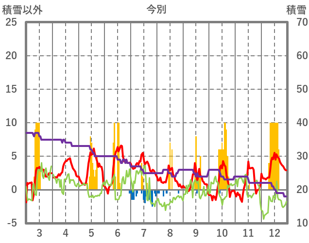 | 日 | 時 | 気温 | 降水 | 風向/風速 | 日照 | 積雪 | 降雪 |