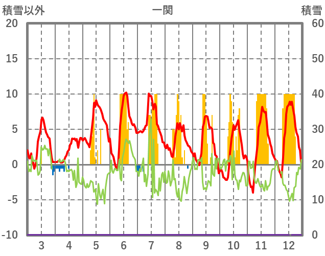 | 日 | 時 | 気温 | 降水 | 風向/風速 | 日照 | 積雪 | 降雪 |
