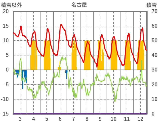 | 日 | 時 | 気温 | 降水 | 風向/風速 | 日照 | 積雪 | 降雪 |