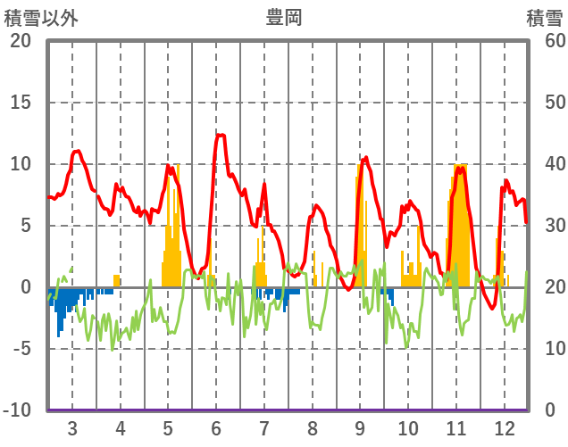 | 日 | 時 | 気温 | 降水 | 風向/風速 | 日照 | 積雪 | 降雪 |