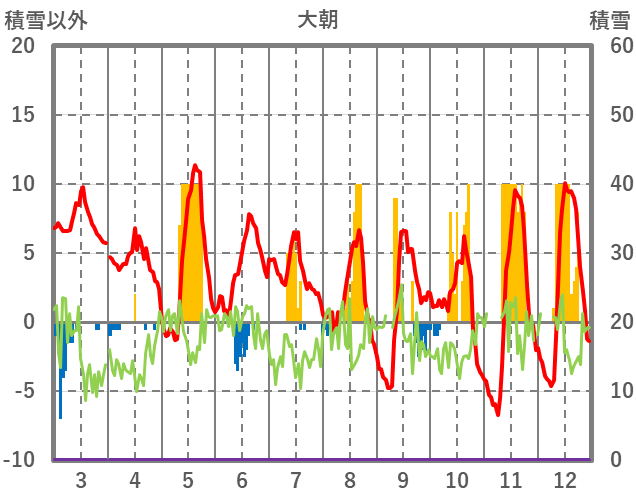 | 日 | 時 | 気温 | 降水 | 風向/風速 | 日照 | 積雪 | 降雪 |
