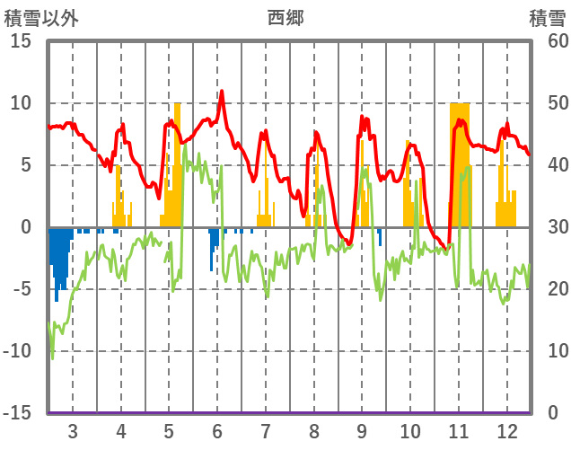 | 日 | 時 | 気温 | 降水 | 風向/風速 | 日照 | 積雪 | 降雪 |