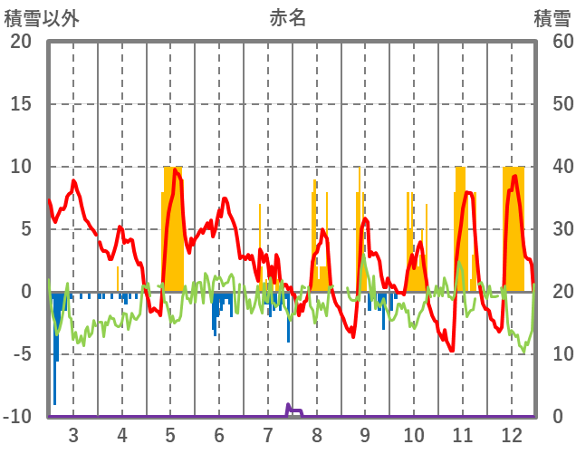 | 日 | 時 | 気温 | 降水 | 風向/風速 | 日照 | 積雪 | 降雪 |