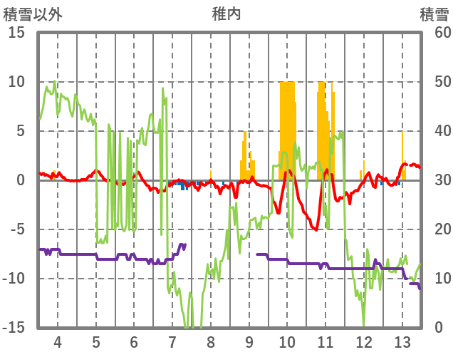 | 日 | 時 | 気温 | 降水 | 風向/風速 | 日照 | 積雪 | 降雪 |