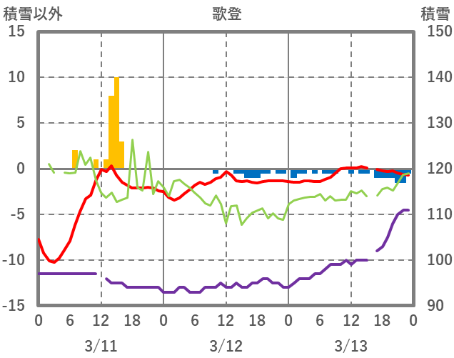 | 日 | 時 | 気温 | 降水 | 風向/風速 | 日照 | 積雪 | 降雪 |