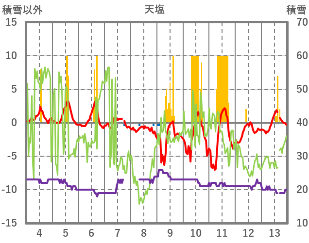 | 日 | 時 | 気温 | 降水 | 風向/風速 | 日照 | 積雪 | 降雪 |