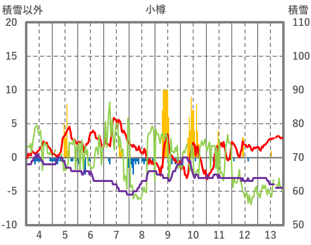 | 日 | 時 | 気温 | 降水 | 風向/風速 | 日照 | 積雪 | 降雪 |