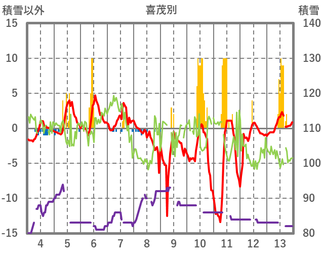 | 日 | 時 | 気温 | 降水 | 風向/風速 | 日照 | 積雪 | 降雪 |