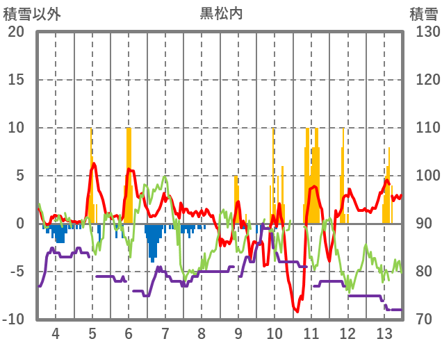 | 日 | 時 | 気温 | 降水 | 風向/風速 | 日照 | 積雪 | 降雪 |