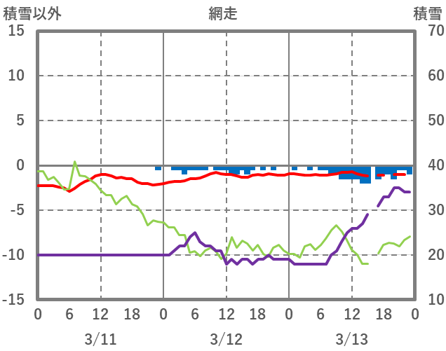 | 日 | 時 | 気温 | 降水 | 風向/風速 | 日照 | 積雪 | 降雪 |