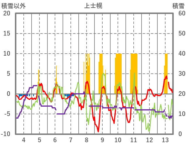 | 日 | 時 | 気温 | 降水 | 風向/風速 | 日照 | 積雪 | 降雪 |