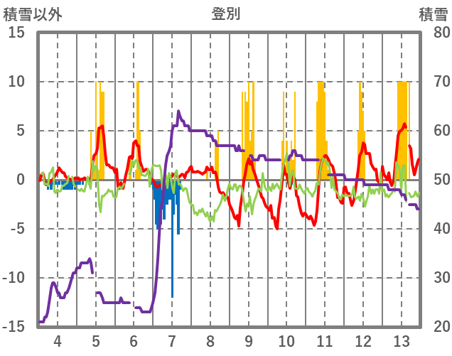 | 日 | 時 | 気温 | 降水 | 風向/風速 | 日照 | 積雪 | 降雪 |
