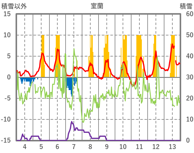 | 日 | 時 | 気温 | 降水 | 風向/風速 | 日照 | 積雪 | 降雪 |