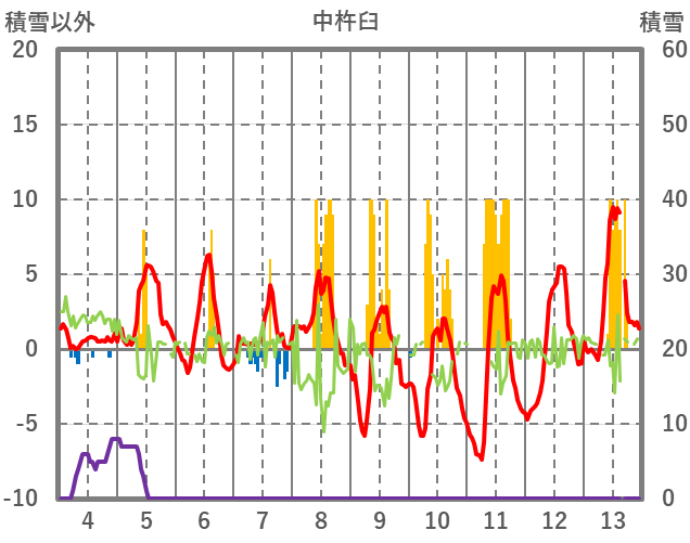 | 日 | 時 | 気温 | 降水 | 風向/風速 | 日照 | 積雪 | 降雪 |