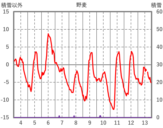 | 日 | 時 | 気温 | 降水 | 風向/風速 | 日照 | 積雪 | 降雪 |