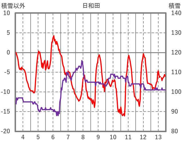 | 日 | 時 | 気温 | 降水 | 風向/風速 | 日照 | 積雪 | 降雪 |