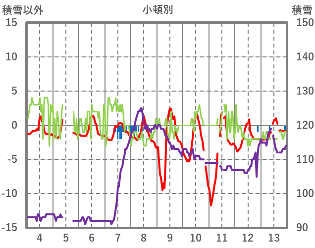 | 日 | 時 | 気温 | 降水 | 風向/風速 | 日照 | 積雪 | 降雪 |