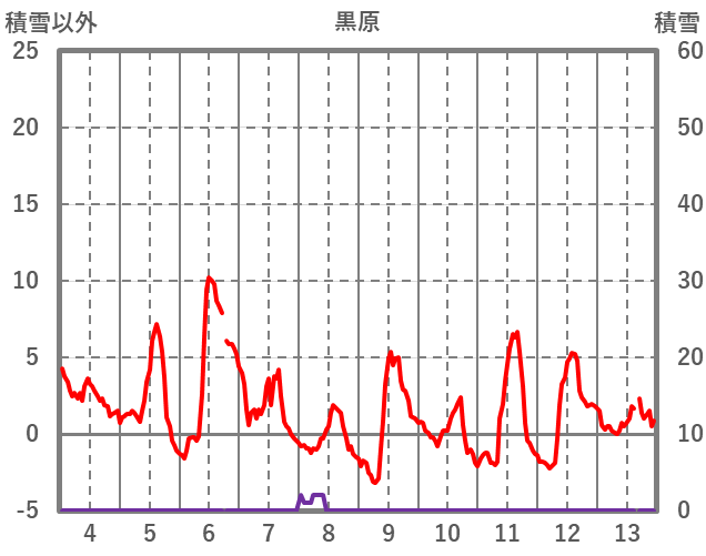 | 日 | 時 | 気温 | 降水 | 風向/風速 | 日照 | 積雪 | 降雪 |