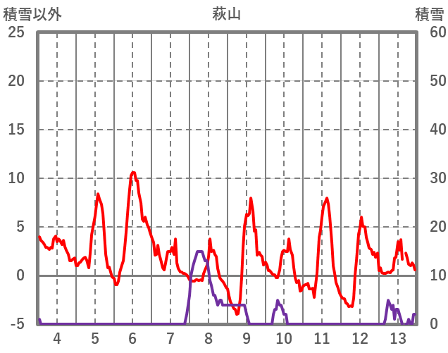 | 日 | 時 | 気温 | 降水 | 風向/風速 | 日照 | 積雪 | 降雪 |