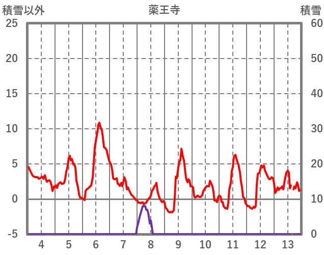 | 日 | 時 | 気温 | 降水 | 風向/風速 | 日照 | 積雪 | 降雪 |