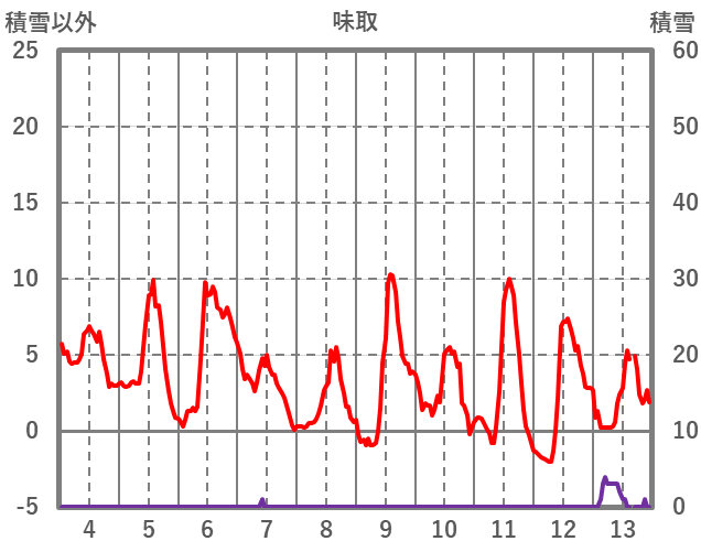 | 日 | 時 | 気温 | 降水 | 風向/風速 | 日照 | 積雪 | 降雪 |
