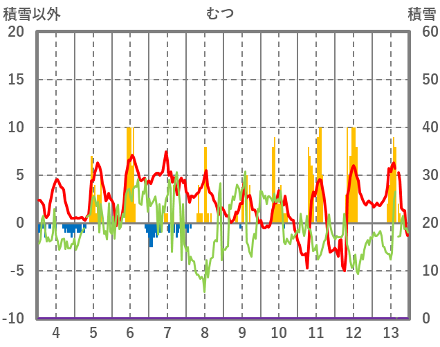 | 日 | 時 | 気温 | 降水 | 風向/風速 | 日照 | 積雪 | 降雪 |