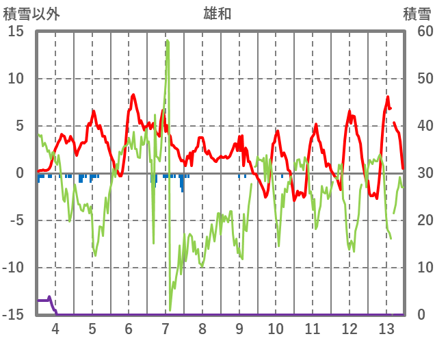 | 日 | 時 | 気温 | 降水 | 風向/風速 | 日照 | 積雪 | 降雪 |