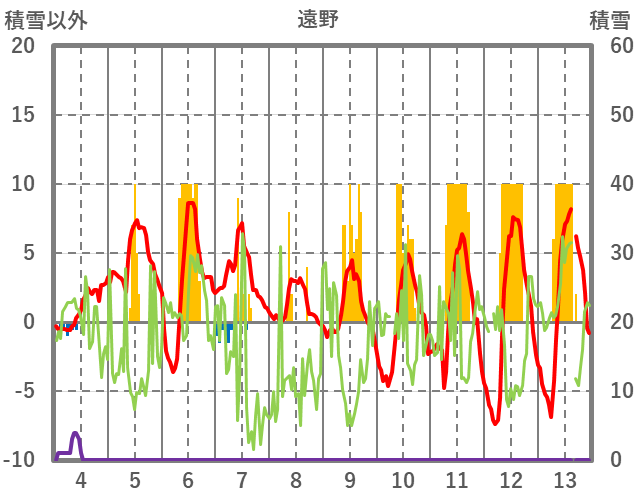 | 日 | 時 | 気温 | 降水 | 風向/風速 | 日照 | 積雪 | 降雪 |