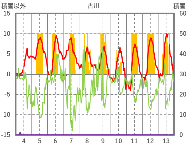 | 日 | 時 | 気温 | 降水 | 風向/風速 | 日照 | 積雪 | 降雪 |