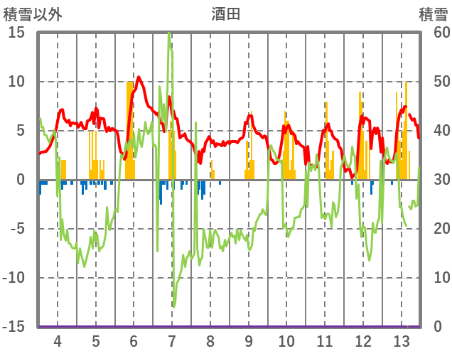 | 日 | 時 | 気温 | 降水 | 風向/風速 | 日照 | 積雪 | 降雪 |