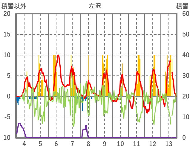 | 日 | 時 | 気温 | 降水 | 風向/風速 | 日照 | 積雪 | 降雪 |
