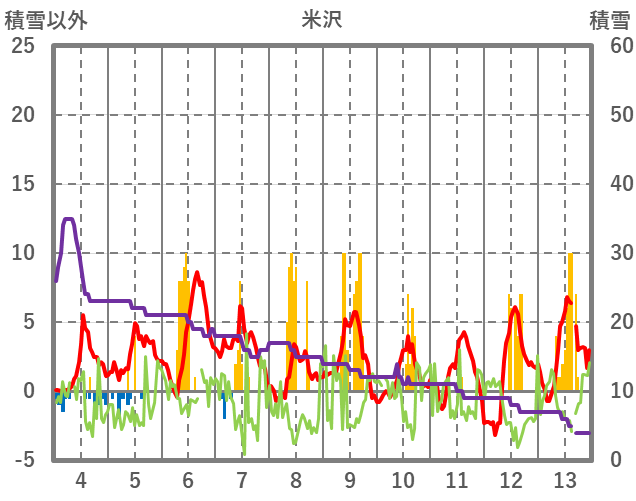 | 日 | 時 | 気温 | 降水 | 風向/風速 | 日照 | 積雪 | 降雪 |