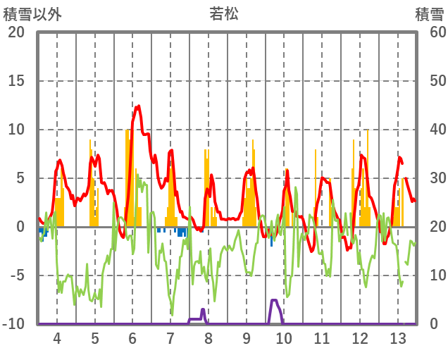 | 日 | 時 | 気温 | 降水 | 風向/風速 | 日照 | 積雪 | 降雪 |