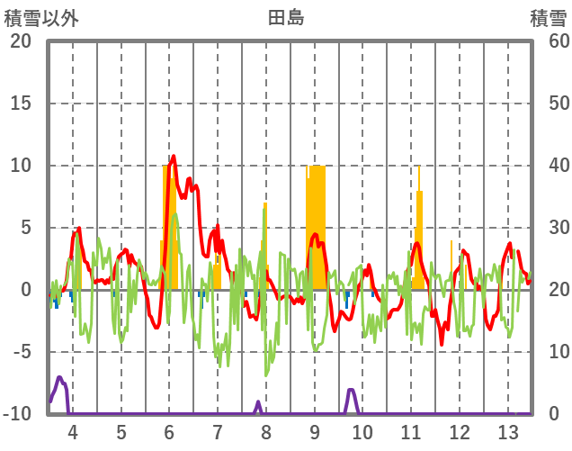 | 日 | 時 | 気温 | 降水 | 風向/風速 | 日照 | 積雪 | 降雪 |