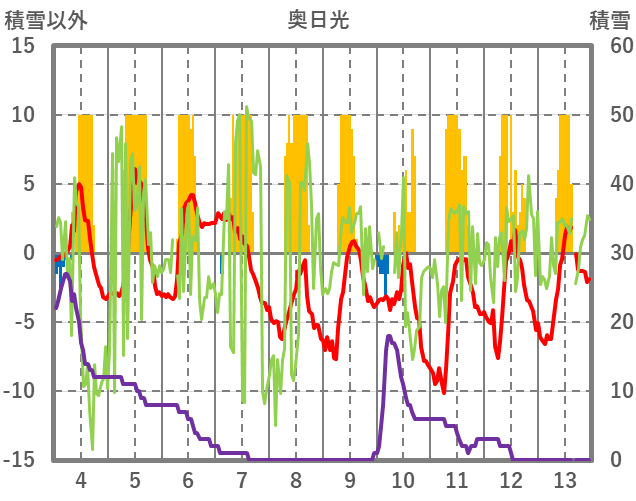 | 日 | 時 | 気温 | 降水 | 風向/風速 | 日照 | 積雪 | 降雪 |