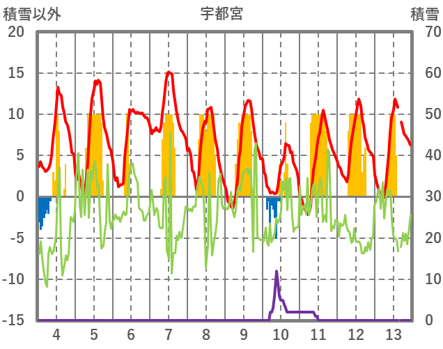 | 日 | 時 | 気温 | 降水 | 風向/風速 | 日照 | 積雪 | 降雪 |