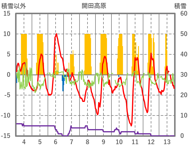 | 日 | 時 | 気温 | 降水 | 風向/風速 | 日照 | 積雪 | 降雪 |