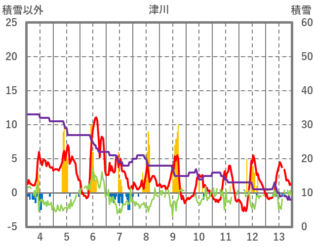| 日 | 時 | 気温 | 降水 | 風向/風速 | 日照 | 積雪 | 降雪 |