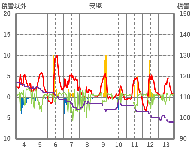 | 日 | 時 | 気温 | 降水 | 風向/風速 | 日照 | 積雪 | 降雪 |