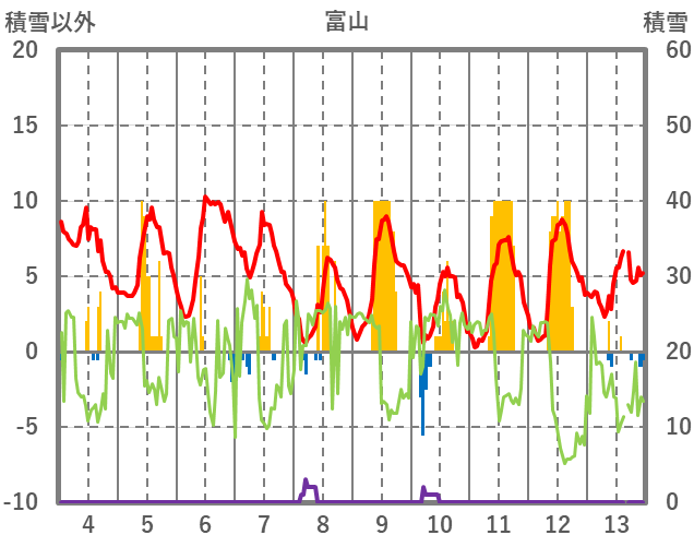 | 日 | 時 | 気温 | 降水 | 風向/風速 | 日照 | 積雪 | 降雪 |
