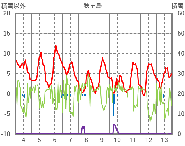 | 日 | 時 | 気温 | 降水 | 風向/風速 | 日照 | 積雪 | 降雪 |
