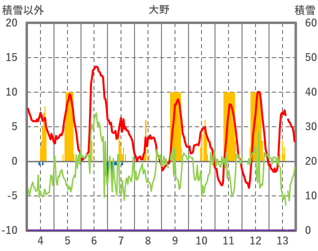 | 日 | 時 | 気温 | 降水 | 風向/風速 | 日照 | 積雪 | 降雪 |
