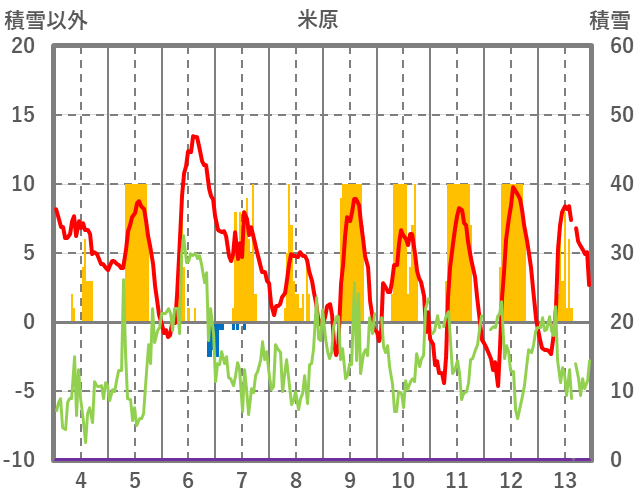 | 日 | 時 | 気温 | 降水 | 風向/風速 | 日照 | 積雪 | 降雪 |