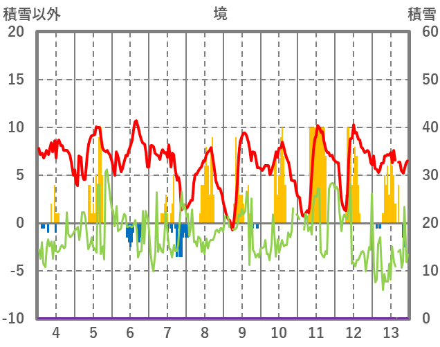| 日 | 時 | 気温 | 降水 | 風向/風速 | 日照 | 積雪 | 降雪 |