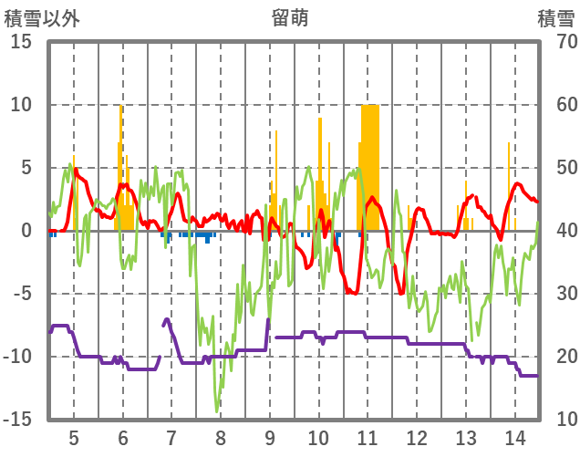 | 日 | 時 | 気温 | 降水 | 風向/風速 | 日照 | 積雪 | 降雪 |