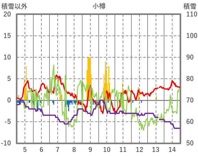 | 日 | 時 | 気温 | 降水 | 風向/風速 | 日照 | 積雪 | 降雪 |